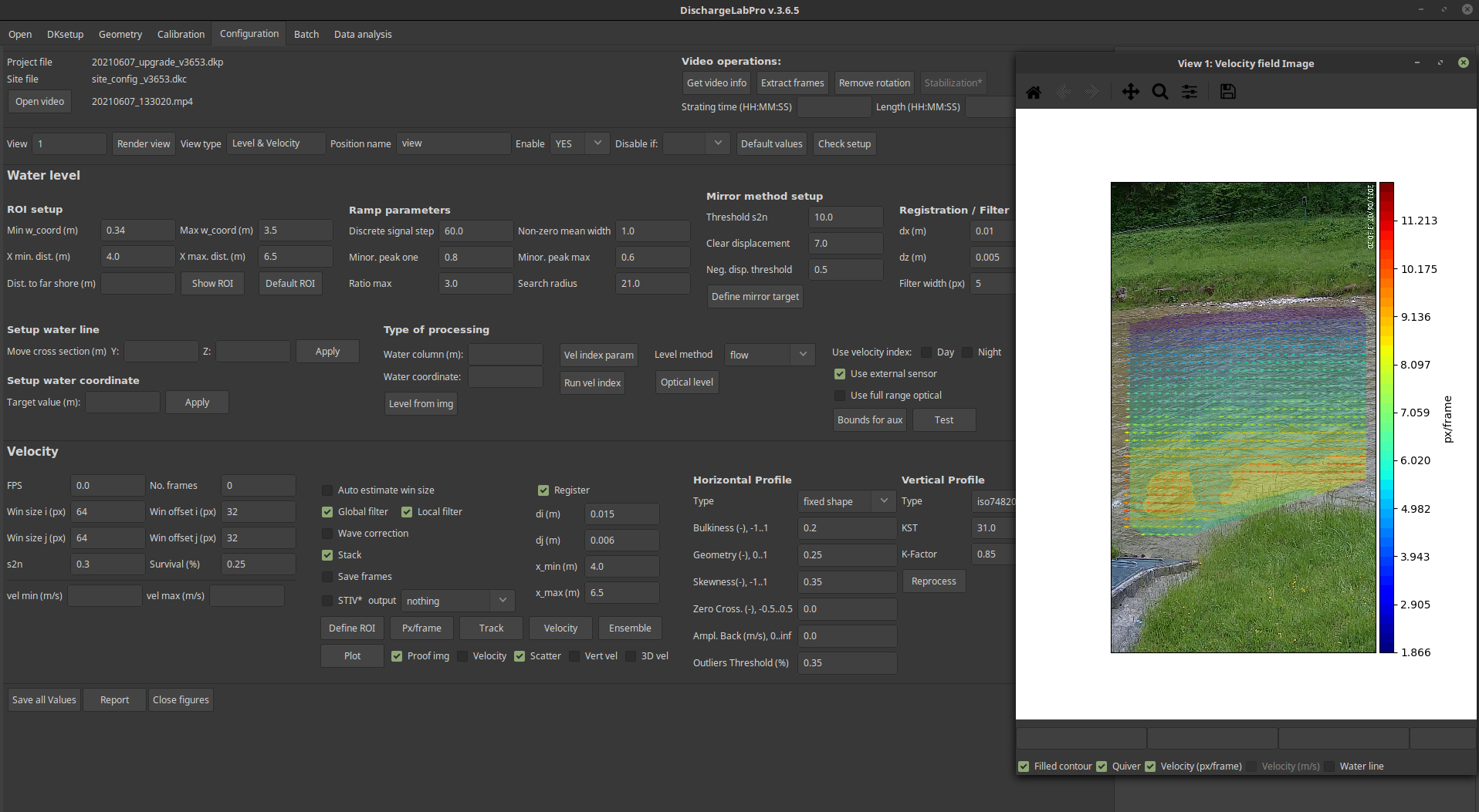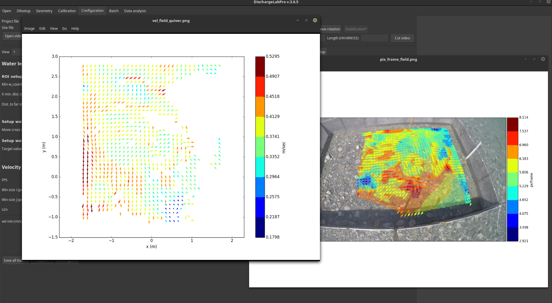 Detailed surface velocity flow in meters/second. If in addition to the video, the camera has been calibrated, it is possible to measure a detailed 2D surface velocity field in metric units.