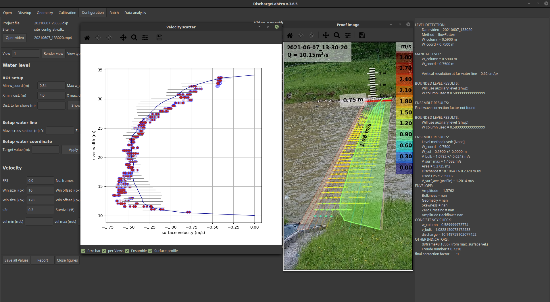 Discharge calculation. Combining the information of the water level, with the surface velocity and the cross section, DLab can calculate the discharge. To do this, it is also necessary to calculate the bulk velocity, DLab has several models to do perform this task.