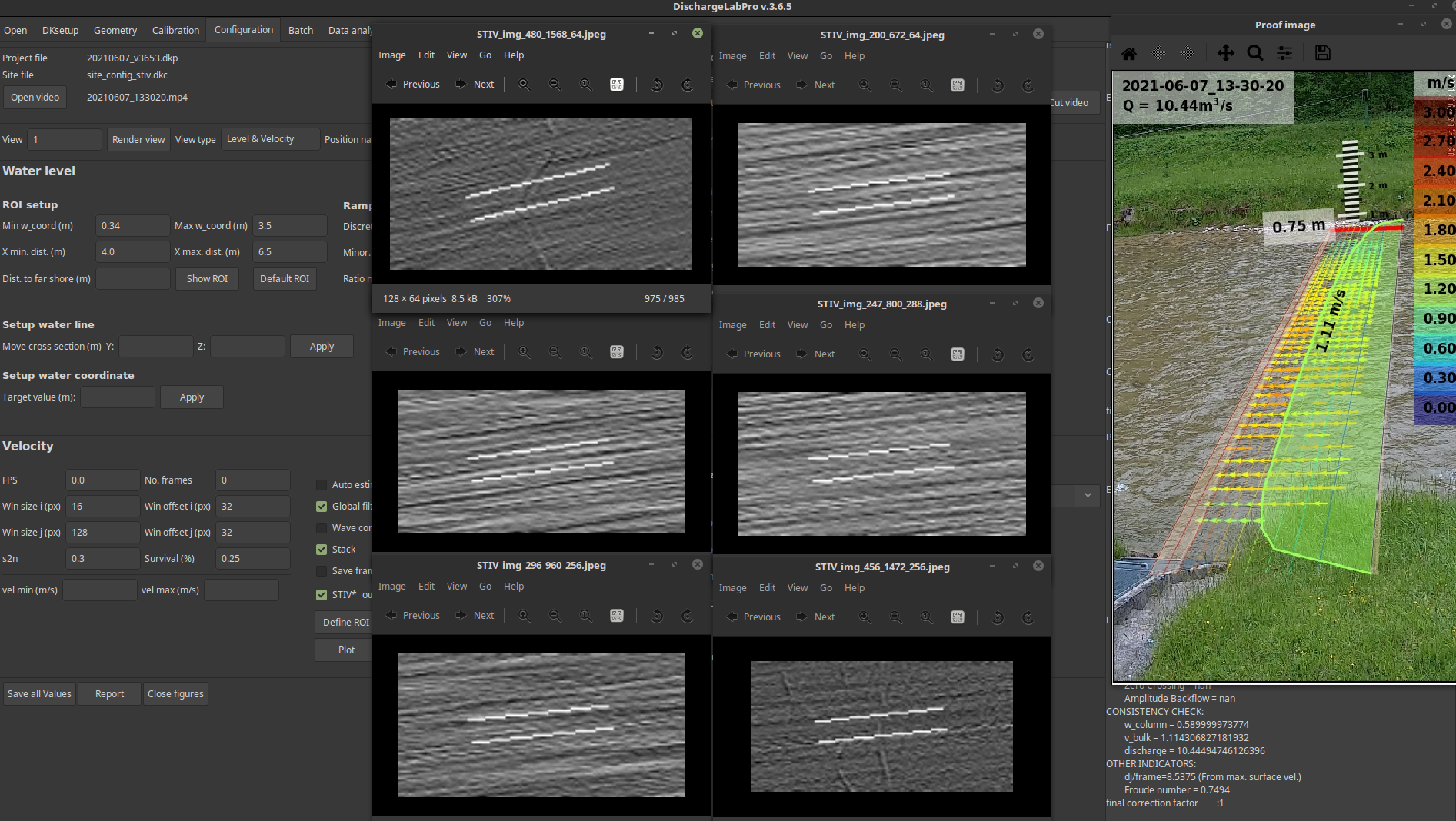 DischargeLab is a full suite for calculating discharge via sequence of images or videos, it guides the user through all the needed steps for obtaining the discharge, from importing the Ground Control Points (GCP) and cross section (XS) to obtaining the discharge. Several steps are done in the way, like camera calibration, distortion removal, orthorectification, optical water level detection, surface velocimetry (using SSIV or STIV) and and discharge calculation.